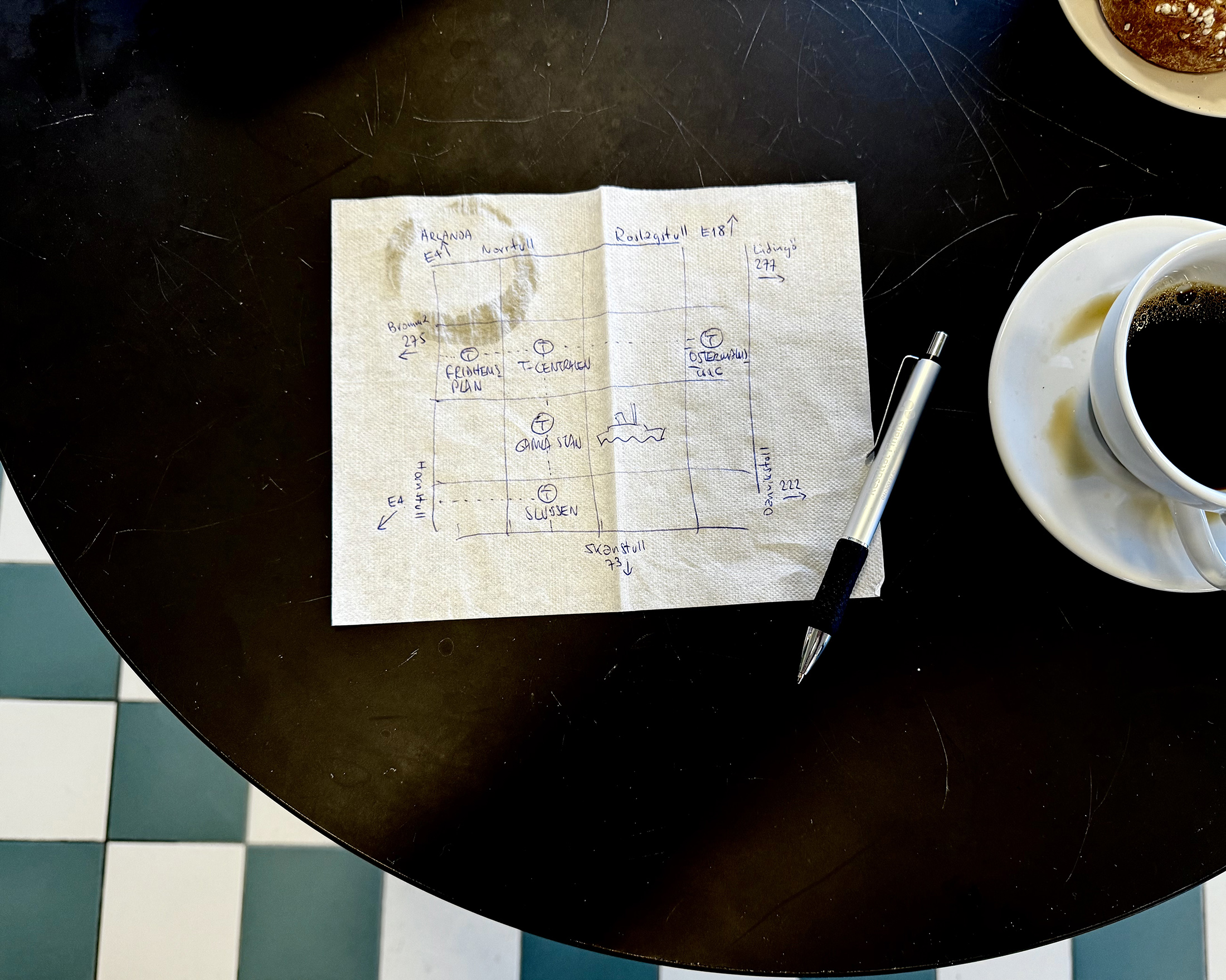 Dessa tankar inspirerade oss att skapa en lösning: en karta över tunnelbanesystemet i Stockholms innerstad. Under vår VD:s raster, på ett café, ritade Francisco den första skissen på en servett. Med sin erfarenhet som taxiförare kunde han förenkla det komplexa tunnelbanelandskapet – från 100 till 19 stationer – så att både lokalbor och turister snabbt ska förstå hur de smidigast tar sig fram och byter mellan stationer och stadsdelar. Vi kallar den för T-banekartan.